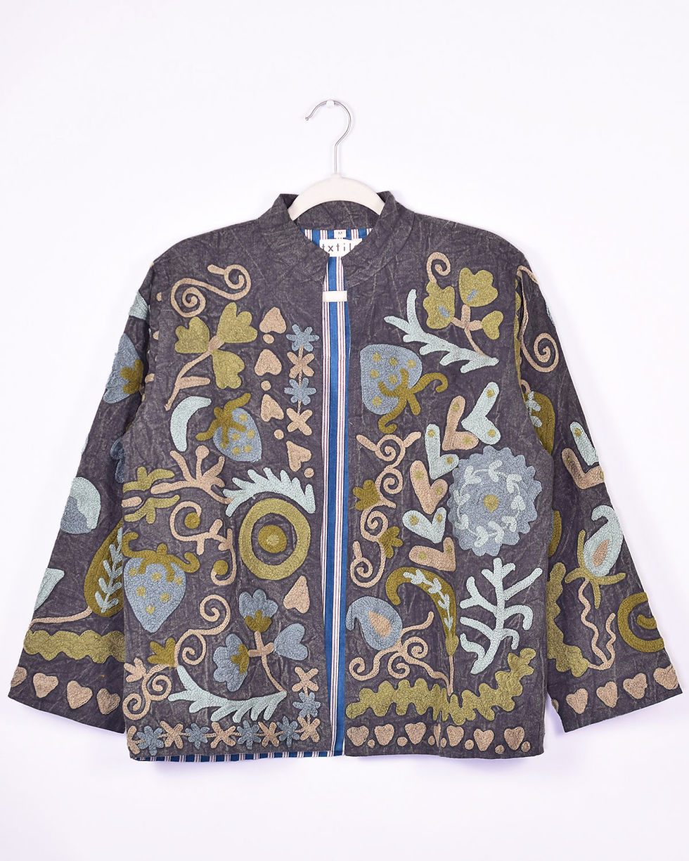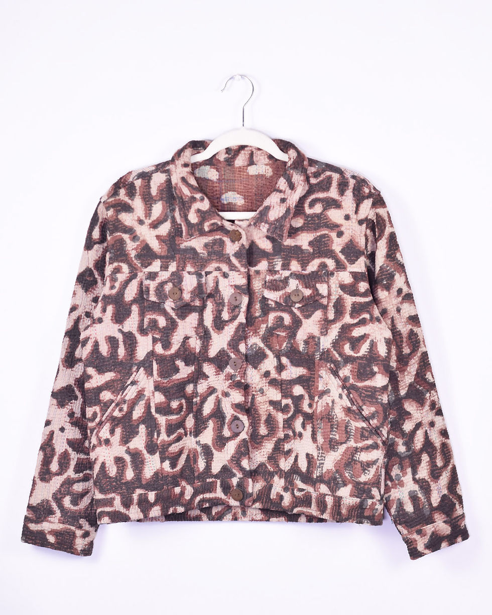 All of our quilted jackets start with Kantha quilts—textiles that have been around for centuries in India and Bangladesh. Traditionally, they’re made by layering old saris and fabrics together with a simple running stitch, creating something totally unique with tons of character.